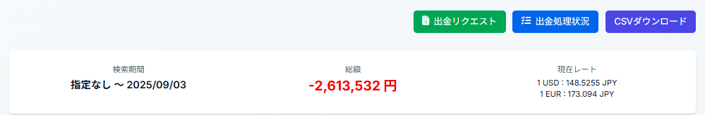額がマイナス表記なのは既に出金済みだからです。塵も積もればなんとやら、ですね!